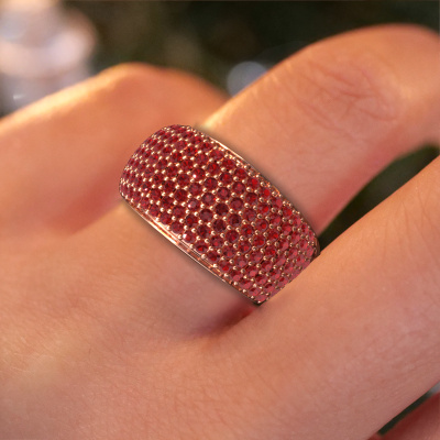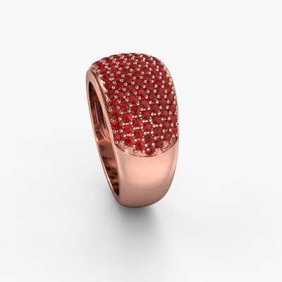 This pave set ring is called Kati. This 14 Carat rose gold ring is set with ruby 1.3 mm. The band of this rose gold ring is set with rows of ruby which seem to have no beginning nor end. Our goldsmith carefully selects the gemstones and sets them with the utmost precision. For maximum shine, the ruby have to align perfectly. While artfully crafting and polishing the jewellery, light fall is constantly monitored, until the expert goldsmith is satisfied with the result. Designed by you, created especially for you!The best part of this pavé set ring is that you can customize it to your own liking. Your style, your choice, your ring. On top of that, your exclusive rose gold ring will be made by hand with eco-friendly materials! Please feel free to easily customize the ring, using our online tool.After receiving your order, our goldsmiths will passionately start the creative process of making your ring in our own studio. Because we don't have a big stockpile, these costs will not be passed on to you. Our pricing is proof of that! We offer top quality jewels at lowest price, guaranteed.To make it easier for you, we offer a 30 day return policy. Check our terms and conditions.