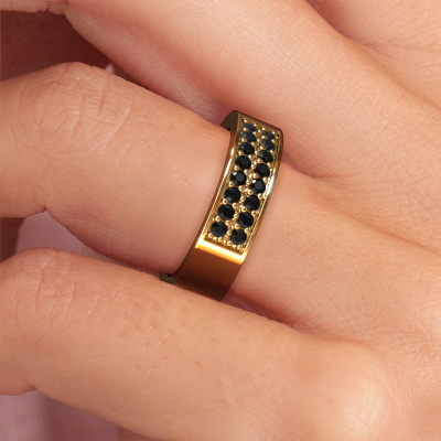 This ring called Catharina 5 is made of 14 Carat gold and is set with black diamond. Are you in the market for a unique gold stackable ring with a modern twist? Then this ring might suit you. Simply customize to your or her liking. It suits the contemporary modern woman. This pavé set stackable ring is set with beautiful black diamond. This has been carefully selected. Because your stackable ring must be adorned with nothing but the most stunning gemstone. Our expert goldsmith will create your ring in our own studio, where the black diamond will be set with great care. The ring will then be polished to perfection to create a stunning ring. After receiving your order, our goldsmiths will passionately start the creative process of making your ring in our own studio. Because we don't have a big stockpile, these costs will not be passed on to you. Our pricing is proof of that! We offer top quality jewels at lowest price, guaranteed.New jewellery designs are added to our online collection daily. Our team of passionate designers strive to create extraordinary and diverse designs. Have you seen a ring you like? Please feel free to contact us. Based on a good price/ quality ratio, we will make you an offer you can't refuse!To make it easier for you, we offer a 30 day return policy. Check our terms and conditions.