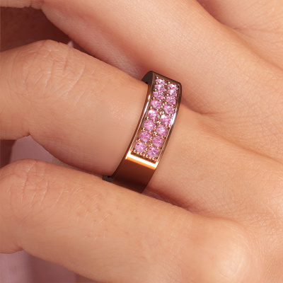 This ring called Catharina 5 is made of 14 Carat rose gold and is set with pink sapphire. Are you in the market for a unique rose gold stackable ring with a modern twist? Then this ring might suit you. Simply customize to your or her liking. It suits the contemporary modern woman. This pavé set stackable ring is set with beautiful pink sapphire. This has been carefully selected. Because your stackable ring must be adorned with nothing but the most stunning gemstone. Our expert goldsmith will create your ring in our own studio, where the pink sapphire will be set with great care. The ring will then be polished to perfection to create a stunning ring. After receiving your order, our goldsmiths will passionately start the creative process of making your ring in our own studio. Because we don't have a big stockpile, these costs will not be passed on to you. Our pricing is proof of that! We offer top quality jewels at lowest price, guaranteed.New jewellery designs are added to our online collection daily. Our team of passionate designers strive to create extraordinary and diverse designs. Have you seen a ring you like? Please feel free to contact us. Based on a good price/ quality ratio, we will make you an offer you can't refuse!To make it easier for you, we offer a 30 day return policy. Check our terms and conditions.