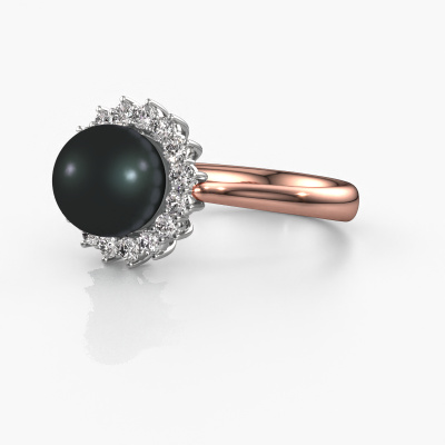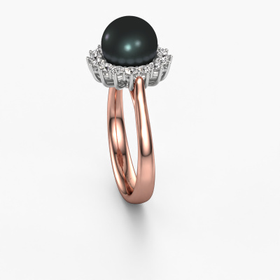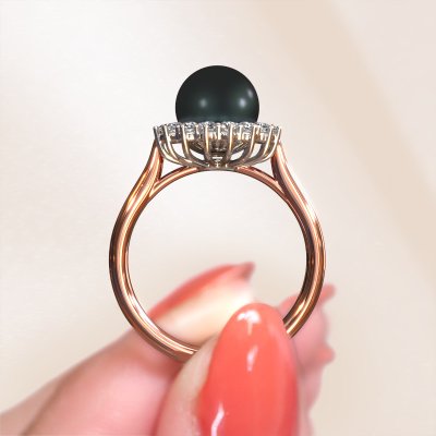 The ring shown above is called the Akiko. We call this type of ring a cluster ring, the centre gemstone is surrounded by smaller sized stones. This 14 Carat rose gold version is set with a 8 mm sphere black pearl centre stone, embraced by smaller lab-grown diamonds. What makes this classic rose gold cluster ring special is the setting of the smaller gems surrounding the centre black pearl, which are shaped like a beautiful flower. The surrounding cluster of stones frame the middle centre stone in such a way to make it appear bigger. This type of ring is also called a flower ring. It is very important that the smaller lab-grown diamonds are positioned identically so there is no interference of light but perfect unity instead. Our skilled Goldsmiths get the job done. Each individual stone is carefully set by hand. During manufacturing, light fall is constantly monitored to make sure the special cluster effect is still visible. In the end you get the perfect ring with a radiant black pearl gemstone centrepiece. You can imagine the effect of a ring of such significance when you give tot the love of your life on her special day to shine. After receiving your order, our goldsmiths will start the creative process of making your Akiko ring. We don't keep stock. This is advantageous because these costs will not be passed on to you. Therefore, we can offer jewellery at exceptionally low prices.