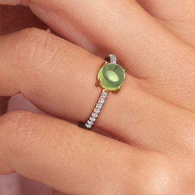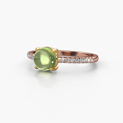 In this photo the rose gold Cathie ring is set with a cabochon peridot. Cabochon means a peridot is shaped first, not faceted, into a specific shape, such as a drop, heart or round cabochon. Subsequently, it is polished until the gemstone has a orb shaped surface. A cabochon gemstone is a stunning, classy eye-catcher that matches perfectly with a contemporary as well as a vintage style. Our expert goldsmiths shape the birthstones ring to perfection which makes it unique. The cabochon peridot is set so its unique qualities are strengthened. How do you like this trendy rose gold ring? Simply customize this Cathie ring, using our online tool. Subsequently, your personal birthstones Cathie ring will be made by hand by our goldsmiths. Precious metals and gemstones can be customized to your liking. Do you have specific preferences which are unavailable in our online tool? Please feel free to contact us. We will customize your personal trendy ring to your liking.By using our modern techniques, we can design and customize the finest quality jewels with the utmost care for you. Our rings are always priced 30 percent lower than other jewellers. We make rings to order, so we don't have to maintain a large stock. If you have a certain budget, we are more than happy to advice you accordingly.To make it easier for you, we offer a 30 day return policy. Check our terms and conditions.