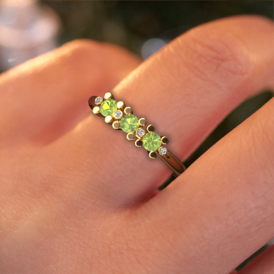 Are you looking for a fashionable ring with small eye-catching gemstones? How do you like this Puk 2 ring? This gold Puk 2 ring is set with beautiful peridot gemstones. The peridot are carefully selected by our peridot suppliers. Subsequently, these gemstones are then set by our goldsmith according to ancient tradition. The ring will then be polished to perfection creating a unique ring with a stunning peridot. Created especially for you. A customized unique ring is the perfect gift! New exquisite designs are added daily by our team of passionate goldsmiths. And each design can be customized. Simply customize the precious metals and the colour of gemstones which will be used, for example. This makes your design of the unique Puk 2 ring truly unique!By using a combination of the latest modern techniques, combined with ancient crafting, we can make all our rings in our own studio. Each jewel is made to order. This is advantageous because we can offer you a price you won't find anywhere else.To make it easier for you, we offer a 30 day return policy. Check our terms and conditions.
