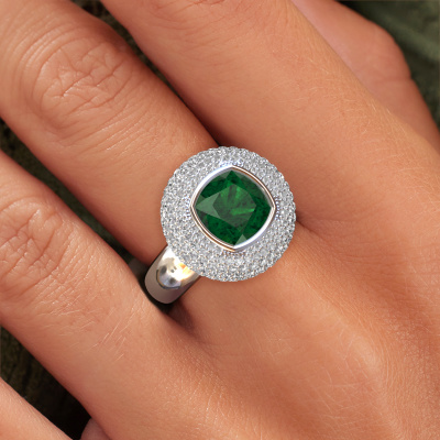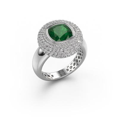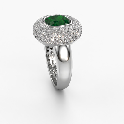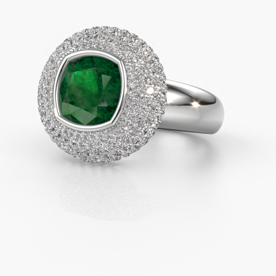 This exclusive platinum Keshia ring is a true work of art! This ring is made of platinum and is set with 8 mm cushion emerald. The smallest ornaments are crafted by our goldsmith with a lot of patience and great passion. In order to create this ring with great precision, this craft requires a keen eye and a skilful hand. A challenge which ignites a fire in our expert goldsmiths. The exquisite emerald are set in a way that their unique qualities are strengthened. This gives the ring an even more glamorous appearance. The ring is unique by itself though, because of the natural birthstones we selected especially for this Keshia ring. And by choosing the precious metal yourself, you create a unique ring. Our goldsmiths passionately create your customized ring to your liking with the utmost care. The platinum ring, as shown here, can be customized using our online tool. Feel free to ask our jewel designers for assistance if you want changes made which are unavailable in our online tool. We are happy to answer your questions.By using our modern techniques, we can design and customize the finest quality jewels with the utmost care for you. Our rings are always priced 30 percent lower than other jewellers. We make rings to order, so we don't have to maintain a large stock. If you have a certain budget, we are more than happy to advice you accordingly.To make it easier for you, we offer a 30 day return policy. Check our terms and conditions.