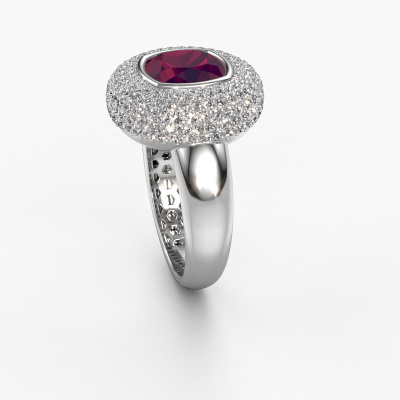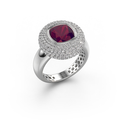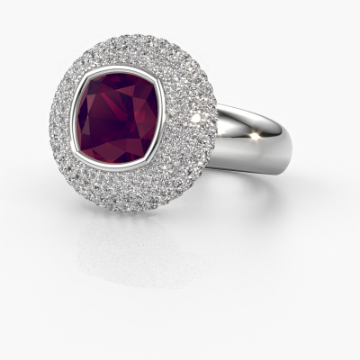 This exclusive platinum Keshia ring is a true work of art! This ring is made of platinum and is set with 8 mm cushion rhodolite. The smallest ornaments are crafted by our goldsmith with a lot of patience and great passion. In order to create this ring with great precision, this craft requires a keen eye and a skilful hand. A challenge which ignites a fire in our expert goldsmiths. The exquisite rhodolite are set in a way that their unique qualities are strengthened. This gives the ring an even more glamorous appearance. The ring is unique by itself though, because of the natural birthstones we selected especially for this Keshia ring. And by choosing the precious metal yourself, you create a unique ring. Our goldsmiths passionately create your customized ring to your liking with the utmost care. The platinum ring, as shown here, can be customized using our online tool. Feel free to ask our jewel designers for assistance if you want changes made which are unavailable in our online tool. We are happy to answer your questions.By using our modern techniques, we can design and customize the finest quality jewels with the utmost care for you. Our rings are always priced 30 percent lower than other jewellers. We make rings to order, so we don't have to maintain a large stock. If you have a certain budget, we are more than happy to advice you accordingly.To make it easier for you, we offer a 30 day return policy. Check our terms and conditions.