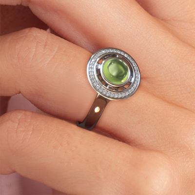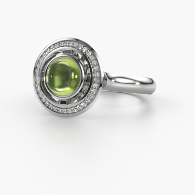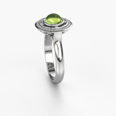 In this photo the platinum Salima ring is set with a cabochon peridot. Cabochon means a peridot is shaped first, not faceted, into a specific shape, such as a drop, heart or round cabochon. Subsequently, it is polished until the gemstone has a orb shaped surface. A cabochon gemstone is a stunning, classy eye-catcher that matches perfectly with a contemporary as well as a vintage style. Our expert goldsmiths shape the special ring to perfection which makes it unique. The cabochon peridot is set so its unique qualities are strengthened. How do you like this design platinum ring? Simply customize this Salima ring, using our online tool. Subsequently, your personal special Salima ring will be made by hand by our goldsmiths. Precious metals and gemstones can be customized to your liking. Do you have specific preferences which are unavailable in our online tool? Please feel free to contact us. We will customize your personal design ring to your liking.After receiving your order, our goldsmiths will passionately start the creative process of making your ring in our own studio. Because we don't have a big stockpile, these costs will not be passed on to you. Our pricing is proof of that! We offer top quality jewels at lowest price, guaranteed.To make it easier for you, we offer a 30 day return policy. Check our terms and conditions.