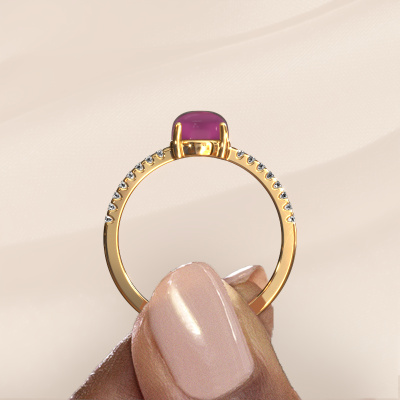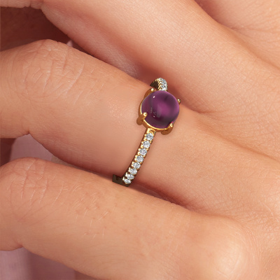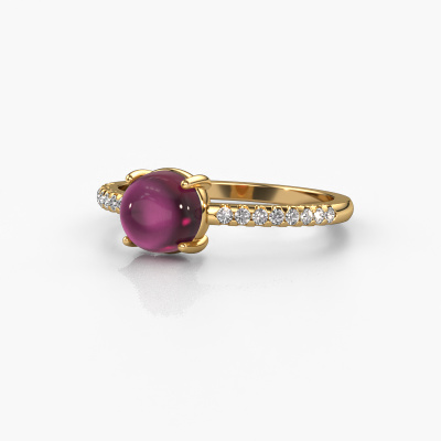 In this photo the gold Cathie ring is set with a cabochon rhodolite. Cabochon means a rhodolite is shaped first, not faceted, into a specific shape, such as a drop, heart or round cabochon. Subsequently, it is polished until the gemstone has a orb shaped surface. A cabochon gemstone is a stunning, classy eye-catcher that matches perfectly with a contemporary as well as a vintage style. Our expert goldsmiths shape the birthstones ring to perfection which makes it unique. The cabochon rhodolite is set so its unique qualities are strengthened. How do you like this trendy gold ring? Simply customize this Cathie ring, using our online tool. Subsequently, your personal birthstones Cathie ring will be made by hand by our goldsmiths. Precious metals and gemstones can be customized to your liking. Do you have specific preferences which are unavailable in our online tool? Please feel free to contact us. We will customize your personal trendy ring to your liking.By using our modern techniques, we can design and customize the finest quality jewels with the utmost care for you. Our rings are always priced 30 percent lower than other jewellers. We make rings to order, so we don't have to maintain a large stock. If you have a certain budget, we are more than happy to advice you accordingly.To make it easier for you, we offer a 30 day return policy. Check our terms and conditions.