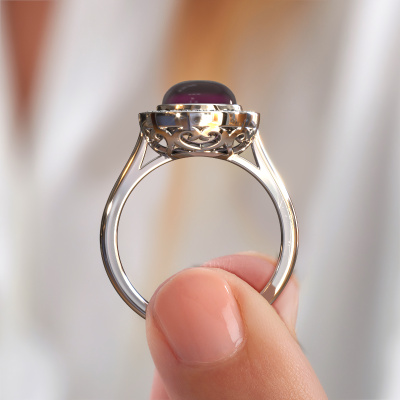 Are you looking for a royal ring with an eye-catching single gemstone? How do you like this Alisa ring? This platinum Alisa ring is set with a beautiful 8 mm round cabochon rhodolite. The rhodolite is carefully selected by our rhodolite suppliers. Subsequently, these birthstones are then set by our goldsmith according to ancient tradition. The ring will then be polished to perfection creating a unique ring with a stunning rhodolite. Created especially for you. A customized fantasy ring is the perfect gift! New exquisite designs are added daily by our team of passionate goldsmiths. And each design can be customized. Simply customize the precious metals and the colour of gemstones which will be used, for example. This makes your design of the fantasy Alisa ring truly unique!Are you on a budget? Please feel free to contact us, so we can go discuss your options. We offer our rings at guaranteed best price, because we make them to order. You won't find such a price anywhere else!To make it easier for you, we offer a 30 day return policy. Check our terms and conditions.