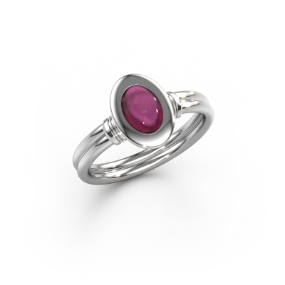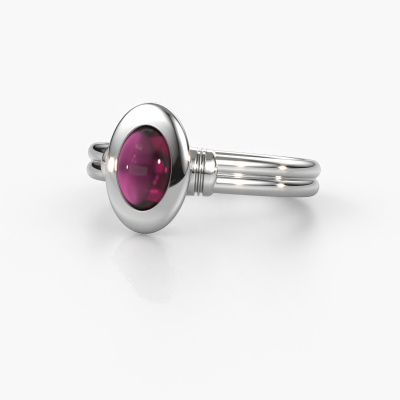 In this photo the platinum Brittni ring is set with a cabochon rhodolite. Cabochon means a rhodolite is shaped first, not faceted, into a specific shape, such as a drop, heart or oval cabochon. Subsequently, it is polished until the gemstone has a orb shaped surface. A cabochon gemstone is a stunning, classy eye-catcher that matches perfectly with a contemporary as well as a vintage style. Our expert goldsmiths shape the tasteful ring to perfection which makes it unique. The cabochon rhodolite is set so its unique qualities are strengthened. Our goldsmiths passionately create your customized ring to your liking with the utmost care. The platinum ring, as shown here, can be customized using our online tool. Feel free to ask our jewel designers for assistance if you want changes made which are unavailable in our online tool. We are happy to answer your questions.Because we design and deliver our own rings, we can offer you a ring at a price you won't find anywhere else. A ring is made to order, which helps prevent excess supplies, so we can make you a great price offer. We understand it feels risky, buying your ring online, but we will gladly assist in the designing process, taking your budget into consideration.To make it easier for you, we offer a 30 day return policy. Check our terms and conditions.