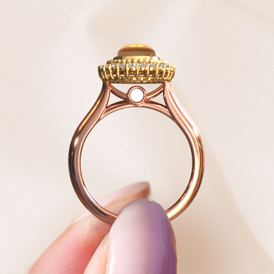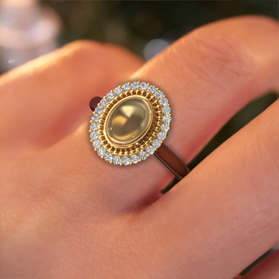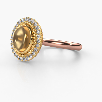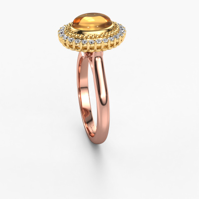 The ring shown above is called the Maartje. We call this type of ring a cluster ring, the centre gemstone is surrounded by smaller sized stones. This 14 Carat rose gold version is set with a 8x6 mm oval cabochon citrin centre stone, embraced by smaller diamonds. If you look at this rose gold cluster ring, you might get the impression that its smaller sized stones collide with the bigger citrin, so it is shaped like a flower. Therefore this ring is also known as the flower ring. Our artisan Goldsmiths get the job done. Each individual stone is carefully set by hand. During manufacturing, light fall is constantly monitored to make sure the special cluster effect is still visible. In the end you get the perfect ring with a radiant citrin gemstone centrepiece. You can imagine the effect of a ring of such significance when you give tot the love of your life on her special day to shine. After receiving your order, our goldsmiths will passionately start the creative process of making your ring in our own studio. Because we don't have a big stockpile, these costs will not be passed on to you. Our pricing is proof of that! We offer top quality jewels at lowest price, guaranteed.Our team of talented, passionate designers add new ring designs to our online collection daily. Our objective in doing so, is to be able to offer you a wide variety of jewels. Please feel free to request a quote if you have specific wishes for your ring. We guarantee to make you an offer you can't refuse.To make it easier for you, we offer a 30 day return policy. Check our terms and conditions.