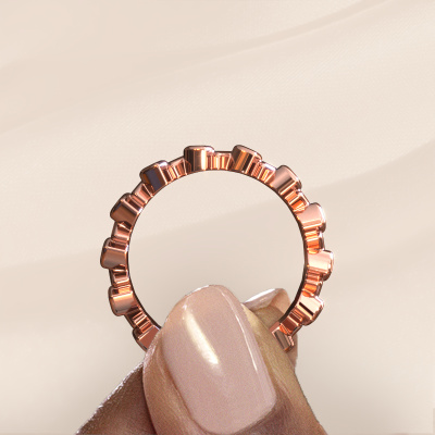 This rose gold Lois stackable ring is the perfect addition to your ring collection! As the name suggests, it is a ring which can be combined on one finger with another ring. It gives you the opportunity to create your own style. A stacked ring usually represents a certain memory of someone special or a memorable moment. It is common to combine a stacked ring, representing an anniversary, with a wedding ring. But this graceful ring, combined with your other rings, also makes a classy fashion item. The graceful Lois stackable ring, as shown here, can be customized to your liking. Our online tool offers many different options but please feel free to contact us if you want changes made to your Lois stackable ring, which are unavailable in our online tool.By using our modern techniques, we can design and customize the finest quality jewels with the utmost care for you. Our rings are always priced 30 percent lower than other jewellers. We make rings to order, so we don't have to maintain a large stock. If you have a certain budget, we are more than happy to advice you accordingly.To make it easier for you, we offer a 30 day return policy. Check our terms and conditions.