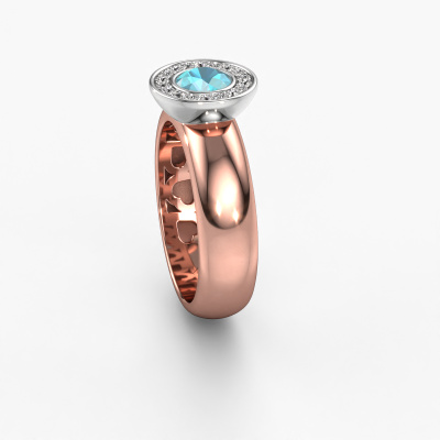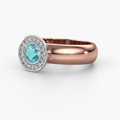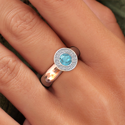 The ring shown above is called Anna. This type of ring is known as a solitaire ring. The 14 Carat rose gold ring is set with a 5 mm round blue topaz centre stone surrounded by smaller sized diamonds. This halo rose gold halo ring, is set with a big blue topaz embraced by smaller sized gemstones. The ring got its name for its halo which the smaller sized diamonds help create. In order to achieve a stunning halo, these smaller sized gemstones have to be aligned perfectly so light reflects evenly on the blue topaz from every angle. And our expert goldsmiths get the job done. Each carefully selected blue topaz is set by hand with utmost precision. During manufacturing, light fall is constantly monitored to make sure the special halo effect is still visible. In the end you get a unique ring with a radiant blue topaz gemstone centrepiece. An exquisite ring indeed! The halo Anna ring, as shown here, can be customized to your liking. Our online tool offers many different options but please feel free to contact us if you want changes made to your Anna ring, which are unavailable in our online tool.Are you on a budget? Please feel free to contact us, so we can go discuss your options. We offer our rings at guaranteed best price, because we make them to order. You won't find such a price anywhere else!To make it easier for you, we offer a 30 day return policy. Check our terms and conditions.