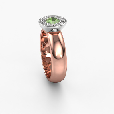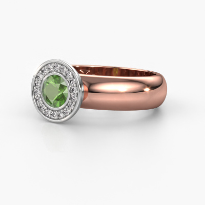The ring shown above is called Anna. This type of ring is known as a solitaire ring. The 14 Carat rose gold ring is set with a 5 mm round tourmaline green centre stone surrounded by smaller sized diamonds. This halo rose gold halo ring, is set with a big tourmaline green embraced by smaller sized gemstones. The ring got its name for its halo which the smaller sized diamonds help create. In order to achieve a stunning halo, these smaller sized gemstones have to be aligned perfectly so light reflects evenly on the tourmaline green from every angle. And our expert goldsmiths get the job done. Each carefully selected tourmaline green is set by hand with utmost precision. During manufacturing, light fall is constantly monitored to make sure the special halo effect is still visible. In the end you get a unique ring with a radiant tourmaline green gemstone centrepiece. An exquisite ring indeed! The halo Anna ring, as shown here, can be customized to your liking. Our online tool offers many different options but please feel free to contact us if you want changes made to your Anna ring, which are unavailable in our online tool.Are you on a budget? Please feel free to contact us, so we can go discuss your options. We offer our rings at guaranteed best price, because we make them to order. You won't find such a price anywhere else!To make it easier for you, we offer a 30 day return policy. Check our terms and conditions.
