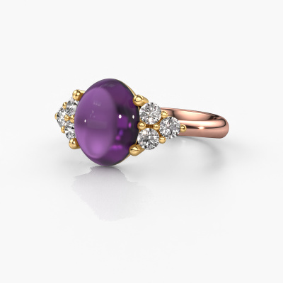 In this photo the rose gold Clarice ring is set with a cabochon amethyst. Cabochon means a amethyst is shaped first, not faceted, into a specific shape, such as a drop, heart or oval cabochon. Subsequently, it is polished until the gemstone has a orb shaped surface. A cabochon gemstone is a stunning, classy eye-catcher that matches perfectly with a contemporary as well as a vintage style. Our expert goldsmiths shape the charming ring to perfection which makes it unique. The cabochon amethyst is set so its unique qualities are strengthened. Customize your own charmingClarice ring, which will then be created by our goldsmiths with great passion. Do you prefer a different option than is shown here in the rose gold Clarice ring? Then our online tools offers various options. Feel free to ask us for help if you are unable to succeed. We are happy to answer your questions!By using a combination of the latest modern techniques, combined with ancient crafting, we can make all our rings in our own studio. Each jewel is made to order. This is advantageous because we can offer you a price you won't find anywhere else.To make it easier for you, we offer a 30 day return policy. Check our terms and conditions.