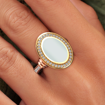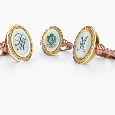 This rose gold women´s signet ring is a true work of art! This is our special Cristina signet ring and it is set with a oval shape green sardonyx. In our crafting studio, we use a combination of the latest techniques and ancient traditional craftsmanship, so we are able to create a detailed perfect signet ring. Our expert goldsmiths are fascinated by signet rings. The signet ring can be engraved with initials or a family weapon. Signet rings with family weapons can be handed down from generation to generation and that usually is the case. On top of that, a signet ring is a beautiful, classy piece of jewellery which is trending once more. More than one reason to start or extend the tradition. Please browse our online database for more options on engravings. You can find the departments of our education centre at the bottom of this page. As soon as you finished designing your Cristina signet ring with our online tool, our goldsmiths will start their creative process of making your ring. This will be done with passion and care, according ancient crafting. On top of that, our jewels are made of eco-friendly materials. Simply customize online with our online tool, if you want any changes made. If you want specific changes made to your Cristina signet ring, that are unavailable in our online tool, please feel free to contact our expert designers.After receiving your order, our goldsmiths will passionately start the creative process of making your ring in our own studio. Because we don't have a big stockpile, these costs will not be passed on to you. Our pricing is proof of that! We offer top quality jewels at lowest price, guaranteed.To make it easier for you, we offer a 30 day return policy. Check our terms and conditions.