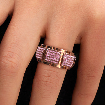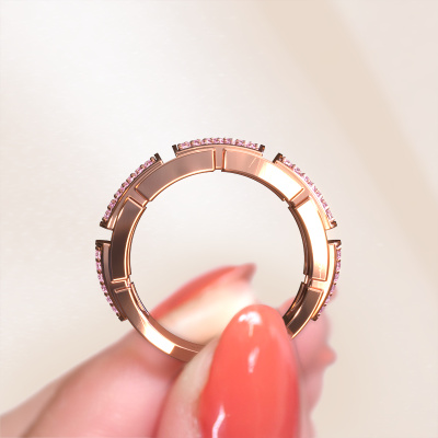 This exclusive rose gold Laura ring is a true work of art! This ring is made of 14 Carat rose gold and is set with 1 mm round pink sapphire. The smallest ornaments are crafted by our goldsmith with a lot of patience and great passion. In order to create this ring with great precision, this craft requires a keen eye and a skilful hand. A challenge which ignites a fire in our expert goldsmiths. The exquisite pink sapphire are set in a way that their unique qualities are strengthened. This gives the ring an even more glamorous appearance. The ring is unique by itself though, because of the natural birthstones we selected especially for this Laura ring. And by choosing the precious metal yourself, you create a unique ring. The best part of this pavé set ring is that you can customize it to your own liking. Your style, your choice, your ring. On top of that, your exclusive rose gold ring will be made by hand with eco-friendly materials! Please feel free to easily customize the ring, using our online tool.By using our modern techniques, we can design and customize the finest quality jewels with the utmost care for you. Our rings are always priced 30 percent lower than other jewellers. We make rings to order, so we don't have to maintain a large stock. If you have a certain budget, we are more than happy to advice you accordingly.To make it easier for you, we offer a 30 day return policy. Check our terms and conditions.