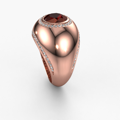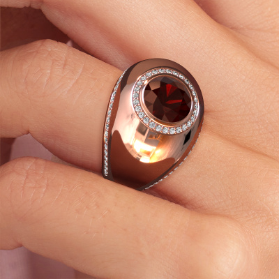 This is a stunning birthstones rose gold Roxann ring. It is set with garnet. A designer ring, fit for classy women. The ring is designed by our own expert goldsmiths. In our artisan studio, we use a combination of the latest techniques and ancient