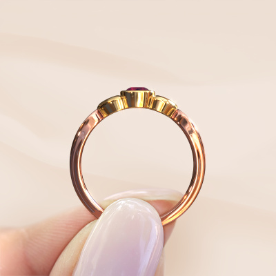 This symbolic rose gold Lorrine ring is set with rhodolite. For some, a ring is nothing more than a beautiful fashion item but they can become a meaningful keepsake. A ring such as this can be worn daily and it matches numerous different styles. Designing your own unique ring, makes it even more special. You are reminded of its uniqueness every time you look at it. Perhaps it reminds you of someone special. It might bring back memories. Unforgettable moments, represented in one ring. The beauty of it all is that the used precious metals and gemstones will last a lifetime. A lifetime of memories deserves nothing less! The best part of this symbolic ring is that you can customize it to your own liking. Your style, your choice, your ring. On top of that, your fantasy rose gold ring will be made by hand with eco-friendly materials! Please feel free to easily customize the ring, using our online tool.After receiving your order, our goldsmiths will start the creative process of making your Lorrine ring. We don't keep stock. This is advantageous because these costs will not be passed on to you. Therefore, we can offer jewellery at exceptionally low prices.To make it easier for you, we offer a 30 day return policy. Check our terms and conditions.