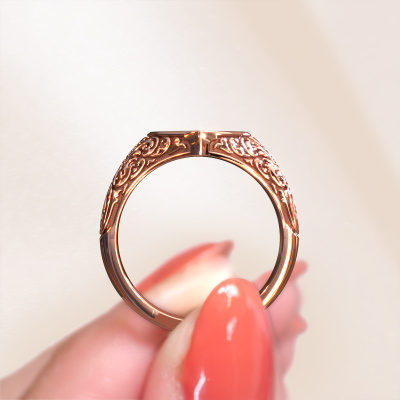 What a special signet ring indeed! This ring is called Jaye. A classy special signet ring, that suits the contemporary, fashionable woman. This signet ring is proof of our new method of crafting. We came up with a process in our own studio in which the old as well as new ways of crafting are unified in perfect harmony. We make a detailed 3D design of the intended ring. Then our expert goldsmith crafts your ring into perfection. A unique ring, styled to your liking. How do you like this vintage rose gold signet ring? Simply customize this Jaye signet ring, using our online tool. Subsequently, your personal special Jaye signet ring will be made by hand by our goldsmiths. Precious metals and gemstones can be customized to your liking. Do you have specific preferences which are unavailable in our online tool? Please feel free to contact us. We will customize your personal vintage signet ring to your liking.After receiving your order, our goldsmiths will start the creative process of making your Jaye ring. We don't keep stock. This is advantageous because these costs will not be passed on to you. Therefore, we can offer jewellery at exceptionally low prices.To make it easier for you, we offer a 30 day return policy. Check our terms and conditions.