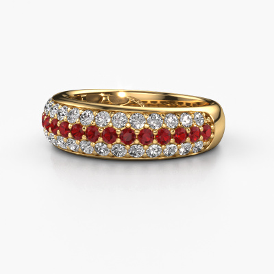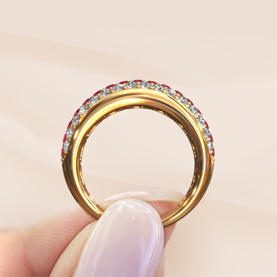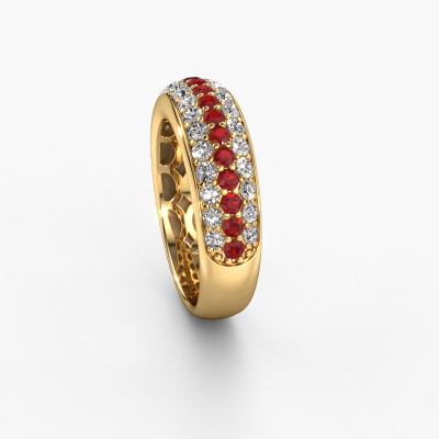This pave set ring is called Emely 8. This 14 Carat gold ring is set with ruby 1.9 mm. The band of this gold ring is set with rows of ruby which seem to have no beginning nor end. Our goldsmith carefully selects the gemstones and sets them with the utmost precision. For maximum shine, the ruby have to align perfectly. While artfully crafting and polishing the jewellery, light fall is constantly monitored, until the expert goldsmith is satisfied with the result. Designed by you, created especially for you!The royal Emely 8 ring, as shown here, can be customized to your liking. Our online tool offers many different options but please feel free to contact us if you want changes made to your Emely 8 ring, which are unavailable in our online tool.After receiving your order, our goldsmiths will passionately start the creative process of making your ring in our own studio. Because we don't have a big stockpile, these costs will not be passed on to you. Our pricing is proof of that! We offer top quality jewels at lowest price, guaranteed.To make it easier for you, we offer a 30 day return policy. Check our terms and conditions.