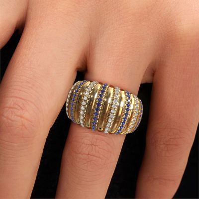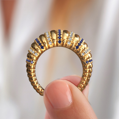 Because of its detailed finish, this wide ring with sapphire has a stylish appearance. A elegant ring that fits the contemporary woman like a glove. This gold ring, our Dawn 14 mm, is a true eye-catcher indeed! As soon as we know what you desire, we will create your ring in our own crafting studio. We work according an innovative process. We use a combination of the latest techniques and ancient traditional craftsmanship, so we are able to create a perfectly designed ring. Our expert goldsmiths strive for perfection so they won't stop until a perfect ring, a true work of art, is created especially for you!Customize your own elegantDawn 14 mm ring, which will then be created by our goldsmiths with great passion. Do you prefer a different option than is shown here in the gold Dawn 14 mm ring? Then our online tools offers various options. Feel free to ask us for help if you are unable to succeed. We are happy to answer your questions!After receiving your order, our goldsmiths will passionately start the creative process of making your ring in our own studio. Because we don't have a big stockpile, these costs will not be passed on to you. Our pricing is proof of that! We offer top quality jewels at lowest price, guaranteed.To make it easier for you, we offer a 30 day return policy. Check our terms and conditions.