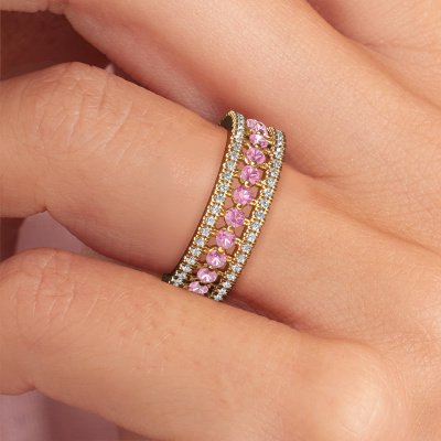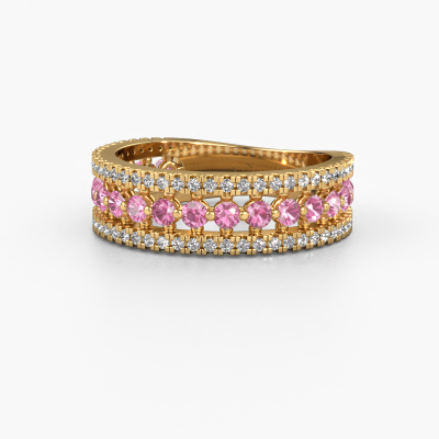 This exclusive gold Elizbeth 1 ring is a true work of art! This ring is made of 14 Carat gold and is set with 2 mm round pink sapphire. The smallest ornaments are crafted by our goldsmith with a lot of patience and great passion. In order to create this ring with great precision, this craft requires a keen eye and a skilful hand. A challenge which ignites a fire in our expert goldsmiths. The exquisite pink sapphire are set in a way that their unique qualities are strengthened. This gives the ring an even more glamorous appearance. The ring is unique by itself though, because of the natural birthstones we selected especially for this Elizbeth 1 ring. And by choosing the precious metal yourself, you create a unique ring. The best part of this sparkling ring is that you can customize it to your own liking. Your style, your choice, your ring. On top of that, your vintage gold ring will be made by hand with eco-friendly materials! Please feel free to easily customize the ring, using our online tool.By using a combination of the latest modern techniques, combined with ancient crafting, we can make all our rings in our own studio. Each jewel is made to order. This is advantageous because we can offer you a price you won't find anywhere else.To make it easier for you, we offer a 30 day return policy. Check our terms and conditions.