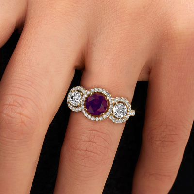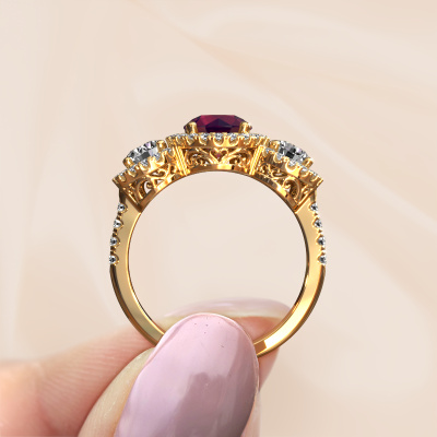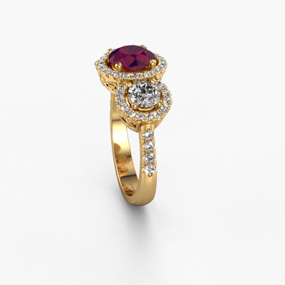 This exclusive gold Lacie ring is a true work of art! This ring is made of 14 Carat gold and is set with 6.5 mm round rhodolite. The smallest ornaments are crafted by our goldsmith with a lot of patience and great passion. In order to create this ring with great precision, this craft requires a keen eye and a skilful hand. A challenge which ignites a fire in our expert goldsmiths. The exquisite rhodolite are set in a way that their unique qualities are strengthened. This gives the ring an even more glamorous appearance. The ring is unique by itself though, because of the natural birthstones we selected especially for this Lacie ring. And by choosing the precious metal yourself, you create a unique ring. Customize your own specialLacie ring, which will then be created by our goldsmiths with great passion. Do you prefer a different option than is shown here in the gold Lacie ring? Then our online tools offers various options. Feel free to ask us for help if you are unable to succeed. We are happy to answer your questions!Because we design and deliver our own rings, we can offer you a ring at a price you won't find anywhere else. A ring is made to order, which helps prevent excess supplies, so we can make you a great price offer. We understand it feels risky, buying your ring online, but we will gladly assist in the designing process, taking your budget into consideration.To make it easier for you, we offer a 30 day return policy. Check our terms and conditions.