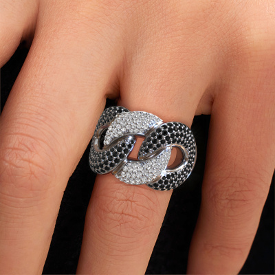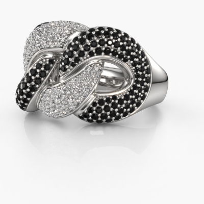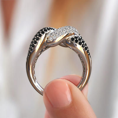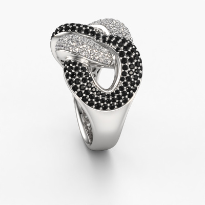 This pave set ring is called Kylie 3 15mm. This platinum ring is set with black diamonds 1.905 crt. The band of this platinum ring is set with rows of black diamonds which seem to have no beginning nor end. Our goldsmith carefully selects the
