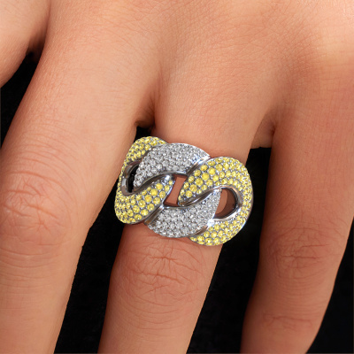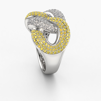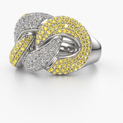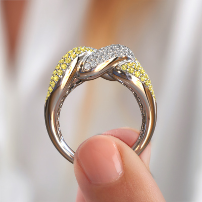 This pave set ring is called Kylie 3 15mm. This platinum ring is set with yellow sapphire 0.8 mm. The band of this platinum ring is set with rows of yellow sapphire which seem to have no beginning nor end. Our goldsmith carefully selects the