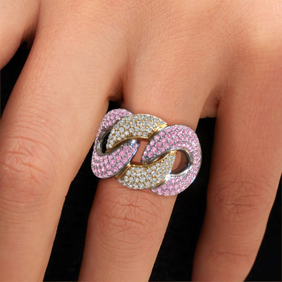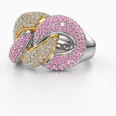 This pave set ring is called Kylie 3 15mm. This 14 Carat white gold ring is set with pink sapphire 0.8 mm. The band of this white gold ring is set with rows of pink sapphire which seem to have no beginning nor end. Our goldsmith carefully selects