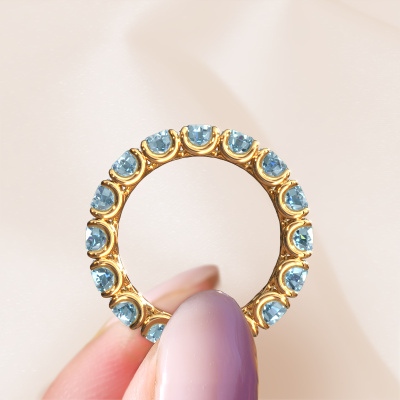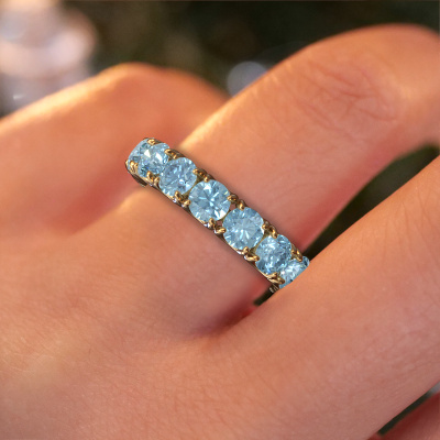 This Estee 4.2 [typer] in 14 Carat gold is set with blue lab grown diamond. This gold stacked Estee 4.2 ring is the perfect addition to your ring collection! As the name suggests, it is a ring which can be combined on one finger with another ring. It gives you the opportunity to create your own style. A stacked ring usually represents a certain memory of someone special or a memorable moment. It is common to combine a stacked ring, representing an anniversary, with a wedding ring. But this eternity ring, combined with your other rings, also makes a classy fashion item.
