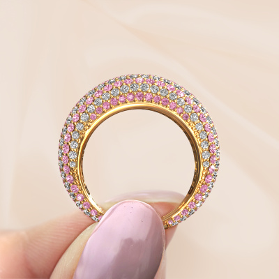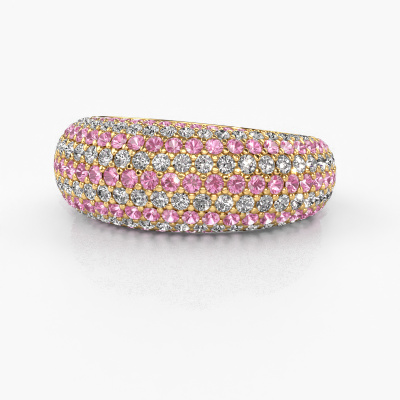 This pave set ring is called Lyndia. This 14 Carat gold ring is set with pink sapphire 0.8 mm. The band of this gold ring is set with rows of pink sapphire which seem to have no beginning nor end. Our goldsmith carefully selects the gemstones and sets them with the utmost precision. For maximum shine, the pink sapphire have to align perfectly. While artfully crafting and polishing the jewellery, light fall is constantly monitored, until the expert goldsmith is satisfied with the result. Designed by you, created especially for you!How do you like this exclusive gold ring? Simply customize this Lyndia ring, using our online tool. Subsequently, your personal stylish Lyndia ring will be made by hand by our goldsmiths. Precious metals and gemstones can be customized to your liking. Do you have specific preferences which are unavailable in our online tool? Please feel free to contact us. We will customize your personal exclusive ring to your liking.After receiving your order, our goldsmiths will start the creative process of making your Lyndia ring. We don't keep stock. This is advantageous because these costs will not be passed on to you. Therefore, we can offer jewellery at exceptionally low prices.To make it easier for you, we offer a 30 day return policy. Check our terms and conditions.