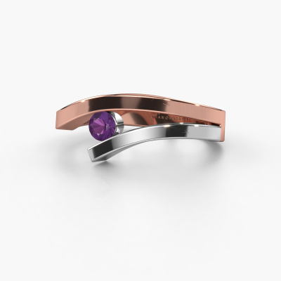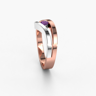 This ring called Evalyn 1 is made of 14 Carat rose gold and is set with amethyst. Are you in the market for a unique rose gold ring with a modern twist? Then this ring might suit you. Simply customize to your or her liking. It suits the contemporary modern woman. This stylish ring is set with beautiful amethyst. This has been carefully selected. Because your ring must be adorned with nothing but the most stunning gemstone. Our expert goldsmith will create your ring in our own studio, where the amethyst will be set with great care. The ring will then be polished to perfection to create a stunning ring. By using a combination of the latest modern techniques, combined with ancient crafting, we can make all our rings in our own studio. Each jewel is made to order. This is advantageous because we can offer you a price you won't find anywhere else.New jewellery designs are added to our online collection daily. Our team of passionate designers strive to create extraordinary and diverse designs. Have you seen a ring you like? Please feel free to contact us. Based on a good price/ quality ratio, we will make you an offer you can't refuse!To make it easier for you, we offer a 30 day return policy. Check our terms and conditions.