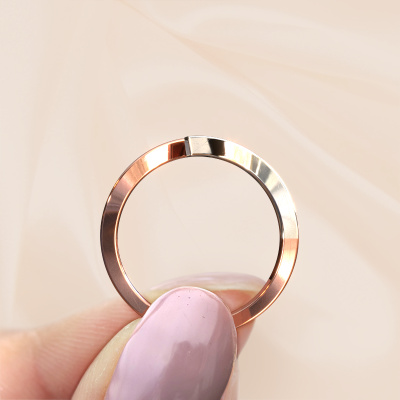 This ring called Evalyn 1 is made of 14 Carat rose gold and is set with diamond. Are you in the market for a unique rose gold ring with a modern twist? Then this ring might suit you. Simply customize to your or her liking. It suits the contemporary modern woman. This stylish ring is set with beautiful diamond. This has been carefully selected. Because your ring must be adorned with nothing but the most stunning gemstone. Our expert goldsmith will create your ring in our own studio, where the diamond will be set with great care. The ring will then be polished to perfection to create a stunning ring. By using a combination of the latest modern techniques, combined with ancient crafting, we can make all our rings in our own studio. Each jewel is made to order. This is advantageous because we can offer you a price you won't find anywhere else.New jewellery designs are added to our online collection daily. Our team of passionate designers strive to create extraordinary and diverse designs. Have you seen a ring you like? Please feel free to contact us. Based on a good price/ quality ratio, we will make you an offer you can't refuse!To make it easier for you, we offer a 30 day return policy. Check our terms and conditions.