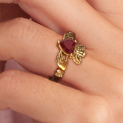 This Irish Claddagh ring is a sign of love set with a heart ruby. It is a remarkable, symbolic ring in which a crowned heart, held by two hands, is shown. The heart of a Claddagh ring is a symbol of love, the hands represent friendship and the crown, loyalty. A beautiful piece of jewellery to either give or receive! This symbolic 14 Carat gold Claddagh 2 ring is made by hand in our own studio by our expert goldsmiths. The symbolic Claddagh 2 ring, as shown here, can be customized to your liking. Our online tool offers many different options but please feel free to contact us if you want changes made to your Claddagh 2 ring, which are unavailable in our online tool.After receiving your order, our goldsmiths will start the creative process of making your Claddagh 2 ring. We don't keep stock. This is advantageous because these costs will not be passed on to you. Therefore, we can offer jewellery at exceptionally low prices.To make it easier for you, we offer a 30 day return policy. Check our terms and conditions.