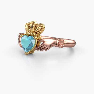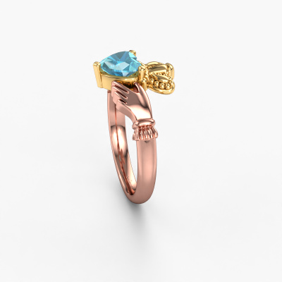 This Irish Claddagh ring is a sign of love set with a heart blue topaz. It is a remarkable, symbolic ring in which a crowned heart, held by two hands, is shown. The heart of a Claddagh ring is a symbol of love, the hands represent friendship and the crown, loyalty. A beautiful piece of jewellery to either give or receive! This symbolic 14 Carat rose gold Claddagh 2 ring is made by hand in our own studio by our expert goldsmiths. The symbolic Claddagh 2 ring, as shown here, can be customized to your liking. Our online tool offers many different options but please feel free to contact us if you want changes made to your Claddagh 2 ring, which are unavailable in our online tool.After receiving your order, our goldsmiths will start the creative process of making your Claddagh 2 ring. We don't keep stock. This is advantageous because these costs will not be passed on to you. Therefore, we can offer jewellery at exceptionally low prices.To make it easier for you, we offer a 30 day return policy. Check our terms and conditions.