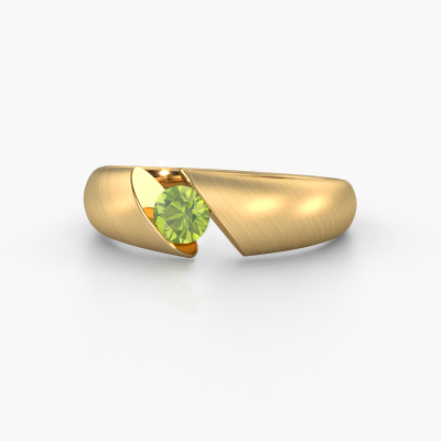 This ring called Hojalien 1 is made of 14 Carat gold and is set with peridot. Are you in the market for a unique gold ring with a modern twist? Then this ring might suit you. Simply customize to your or her liking. It suits the contemporary modern woman. This tasteful ring is set with beautiful peridot. This has been carefully selected. Because your ring must be adorned with nothing but the most stunning gemstone. Our expert goldsmith will create your ring in our own studio, where the peridot will be set with great care. The ring will then be polished to perfection to create a stunning ring. By using our modern techniques, we can design and customize the finest quality jewels with the utmost care for you. Our rings are always priced 30 percent lower than other jewellers. We make rings to order, so we don't have to maintain a large stock. If you have a certain budget, we are more than happy to advice you accordingly.