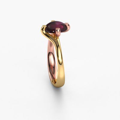 In this photo the rose gold Nora ring is set with a cabochon rhodolite. Cabochon means a rhodolite is shaped first, not faceted, into a specific shape, such as a drop, heart or oval cabochon. Subsequently, it is polished until the gemstone has a orb shaped surface. A cabochon gemstone is a stunning, classy eye-catcher that matches perfectly with a contemporary as well as a vintage style. Our expert goldsmiths shape the graceful ring to perfection which makes it unique. The cabochon rhodolite is set so its unique qualities are strengthened. How do you like this trendy rose gold ring? Simply customize this Nora ring, using our online tool. Subsequently, your personal graceful Nora ring will be made by hand by our goldsmiths. Precious metals and gemstones can be customized to your liking. Do you have specific preferences which are unavailable in our online tool? Please feel free to contact us. We will customize your personal trendy ring to your liking.After receiving your order, our goldsmiths will passionately start the creative process of making your ring in our own studio. Because we don't have a big stockpile, these costs will not be passed on to you. Our pricing is proof of that! We offer top quality jewels at lowest price, guaranteed.To make it easier for you, we offer a 30 day return policy. Check our terms and conditions.