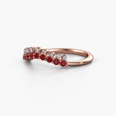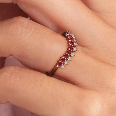 This Vivian A stackable ring in 14 Carat rose gold is set with ruby. This rose gold stacked Vivian A ring is the perfect addition to your ring collection! As the name suggests, it is a ring which can be combined on one finger with another ring. It gives you the opportunity to create your own style. A stacked ring usually represents a certain memory of someone special or a memorable moment. It is common to combine a stacked ring, representing an anniversary, with a wedding ring. But this refined ring, combined with your other rings, also makes a classy fashion item. The refined Vivian A stackable ring, as shown here, can be customized to your liking. Our online tool offers many different options but please feel free to contact us if you want changes made to your Vivian A stackable ring, which are unavailable in our online tool.Are you on a budget? Please feel free to contact us, so we can go discuss your options. We offer our rings at guaranteed best price, because we make them to order. You won't find such a price anywhere else!To make it easier for you, we offer a 30 day return policy. Check our terms and conditions.
