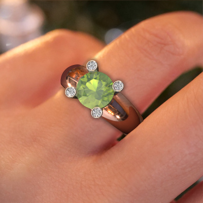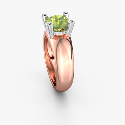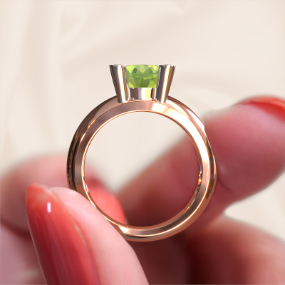 Are you looking for a special ring with an eye-catching single gemstone? How do you like this Tamara RND ring? This rose gold Tamara RND ring is set with a beautiful 8 mm round peridot. The peridot is carefully selected by our peridot suppliers. Subsequently, these gemstones are then set by our goldsmith according to ancient tradition. The ring will then be polished to perfection creating a unique ring with a stunning peridot. Created especially for you. The best part of this special ring is that you can customize it to your own liking. Your style, your choice, your ring. On top of that, your trendy rose gold ring will be made by hand with eco-friendly materials! Please feel free to easily customize the ring, using our online tool.By using a combination of the latest modern techniques, combined with ancient crafting, we can make all our rings in our own studio. Each jewel is made to order. This is advantageous because we can offer you a price you won't find anywhere else.To make it easier for you, we offer a 30 day return policy. Check our terms and conditions.