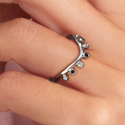 This Drop B stacking ring in 14 Carat white gold is set with black diamond. This white gold stacked Drop B ring is the perfect addition to your ring collection! As the name suggests, it is a ring which can be combined on one finger with another ring. It gives you the opportunity to create your own style. A stacked ring usually represents a certain memory of someone special or a memorable moment. It is common to combine a stacked ring, representing an anniversary, with a wedding ring. But this beautiful ring, combined with your other rings, also makes a classy fashion item. Customize your own beautifulDrop B stacking ring, which will then be created by our goldsmiths with great passion. Do you prefer a different option than is shown here in the white gold Drop B stacking ring? Then our online tools offers various options. Feel free to ask us for help if you are unable to succeed. We are happy to answer your questions!By using a combination of the latest modern techniques, combined with ancient crafting, we can make all our rings in our own studio. Each jewel is made to order. This is advantageous because we can offer you a price you won't find anywhere else.To make it easier for you, we offer a 30 day return policy. Check our terms and conditions.