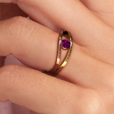 This ring called Sigrid 1 is made of 14 Carat rose gold and is set with rhodolite. Are you in the market for a unique rose gold ring with a modern twist? Then this ring might suit you. Simply customize to your or her liking. It suits the contemporary modern woman. This twist ring is set with beautiful rhodolite. This has been carefully selected. Because your ring must be adorned with nothing but the most stunning gemstone. Our expert goldsmith will create your ring in our own studio, where the rhodolite will be set with great care. The ring will then be polished to perfection to create a stunning ring. By using our modern techniques, we can design and customize the finest quality jewels with the utmost care for you. Our rings are always priced 30 percent lower than other jewellers. We make rings to order, so we don't have to maintain a large stock. If you have a certain budget, we are more than happy to advice you accordingly.Our team of talented, passionate designers add new ring designs to our online collection daily. Our objective in doing so, is to be able to offer you a wide variety of jewels. Please feel free to request a quote if you have specific wishes for your ring. We guarantee to make you an offer you can't refuse.To make it easier for you, we offer a 30 day return policy. Check our terms and conditions.