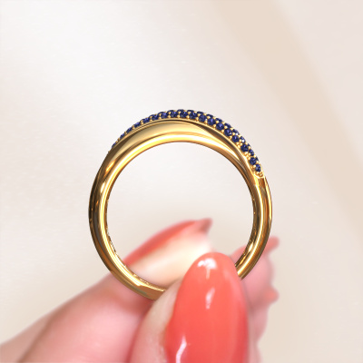 This pave set ring is called Rosie. This 14 Carat gold ring is set with sapphire 0.9 mm. The band of this gold ring is set with rows of sapphire which seem to have no beginning nor end. Our goldsmith carefully selects the gemstones and sets them with the utmost precision. For maximum shine, the sapphire have to align perfectly. While artfully crafting and polishing the jewellery, light fall is constantly monitored, until the expert goldsmith is satisfied with the result. Designed by you, created especially for you!How do you like this modern gold ring? Simply customize this Rosie ring, using our online tool. Subsequently, your personal twist Rosie ring will be made by hand by our goldsmiths. Precious metals and gemstones can be customized to your liking. Do you have specific preferences which are unavailable in our online tool? Please feel free to contact us. We will customize your personal modern ring to your liking.Are you on a budget? Please feel free to contact us, so we can go discuss your options. We offer our rings at guaranteed best price, because we make them to order. You won't find such a price anywhere else!To make it easier for you, we offer a 30 day return policy. Check our terms and conditions.