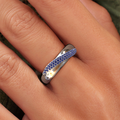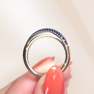 This pave set ring is called Rosie. This platinum ring is set with sapphire 0.9 mm. The band of this platinum ring is set with rows of sapphire which seem to have no beginning nor end. Our goldsmith carefully selects the gemstones and sets them with the utmost precision. For maximum shine, the sapphire have to align perfectly. While artfully crafting and polishing the jewellery, light fall is constantly monitored, until the expert goldsmith is satisfied with the result. Designed by you, created especially for you!How do you like this modern platinum ring? Simply customize this Rosie ring, using our online tool. Subsequently, your personal twist Rosie ring will be made by hand by our goldsmiths. Precious metals and gemstones can be customized to your liking. Do you have specific preferences which are unavailable in our online tool? Please feel free to contact us. We will customize your personal modern ring to your liking.Are you on a budget? Please feel free to contact us, so we can go discuss your options. We offer our rings at guaranteed best price, because we make them to order. You won't find such a price anywhere else!To make it easier for you, we offer a 30 day return policy. Check our terms and conditions.
