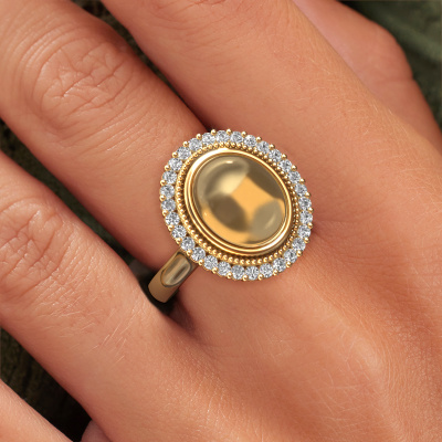 In this photo the gold Mila ring is set with a cabochon citrin. Cabochon means a citrin is shaped first, not faceted, into a specific shape, such as a drop, heart or oval cabochon. Subsequently, it is polished until the gemstone has a orb shaped surface. A cabochon gemstone is a stunning, classy eye-catcher that matches perfectly with a contemporary as well as a vintage style. Our expert goldsmiths shape the cluster ring to perfection which makes it unique. The cabochon citrin is set so its unique qualities are strengthened. Our goldsmiths passionately create your customized ring to your liking with the utmost care. The gold ring, as shown here, can be customized using our online tool. Feel free to ask our jewel designers for assistance if you want changes made which are unavailable in our online tool. We are happy to answer your questions.By using a combination of the latest modern techniques, combined with ancient crafting, we can make all our rings in our own studio. Each jewel is made to order. This is advantageous because we can offer you a price you won't find anywhere else.To make it easier for you, we offer a 30 day return policy. Check our terms and conditions.