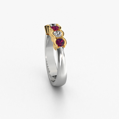 This ring is called Lotte 5. It is made of 14 Carat white gold and is set with 3 mm rhodolite. Are you looking for a unique white gold ring with a modern appearance? Then this is the ring for you. Simply customize to your or her liking. Perfect for a modern, contemporary woman! This 5 stones ring is adorned with stunning rhodolite. It was carefully selected because your ring must be adorned with nothing but the most beautiful gemstones. Our expert goldsmith will create your ring in our own studio, where the rhodolite will be set with great care. The ring will then be polished to perfection to create a beautiful ring. By using a combination of the latest modern techniques, combined with ancient crafting, we can make all our rings in our own studio. Each jewel is made to order. This is advantageous because we can offer you a price you won't find anywhere else.Our team of talented, passionate designers add new ring designs to our online collection daily. Our objective in doing so, is to be able to offer you a wide variety of jewels. Please feel free to request a quote if you have specific wishes for your ring. We guarantee to make you an offer you can't refuse.To make it easier for you, we offer a 30 day return policy. Check our terms and conditions.