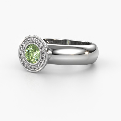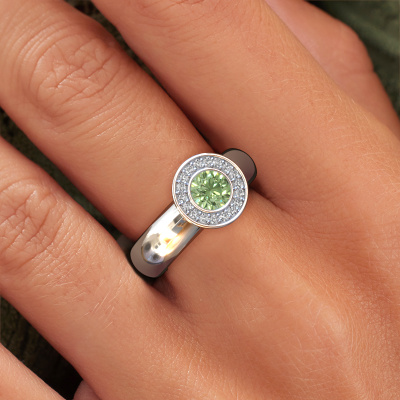 The ring shown above is called Anna. This type of ring is known as a solitaire ring. The 14 Carat white gold ring is set with a 5 mm round green lab grown diamond centre stone surrounded by smaller sized diamonds. This halo white gold halo ring, is set with a big green lab grown diamond embraced by smaller sized gemstones. The ring got its name for its halo which the smaller sized diamonds help create. In order to achieve a stunning halo, these smaller sized gemstones have to be aligned perfectly so light reflects evenly on the green lab grown diamond from every angle. And our expert goldsmiths get the job done. Each carefully selected green lab grown diamond is set by hand with utmost precision. During manufacturing, light fall is constantly monitored to make sure the special halo effect is still visible. In the end you get a unique ring with a radiant green lab grown diamond gemstone centrepiece. An exquisite ring indeed! The halo Anna ring, as shown here, can be customized to your liking. Our online tool offers many different options but please feel free to contact us if you want changes made to your Anna ring, which are unavailable in our online tool.Are you on a budget? Please feel free to contact us, so we can go discuss your options. We offer our rings at guaranteed best price, because we make them to order. You won't find such a price anywhere else!To make it easier for you, we offer a 30 day return policy. Check our terms and conditions.