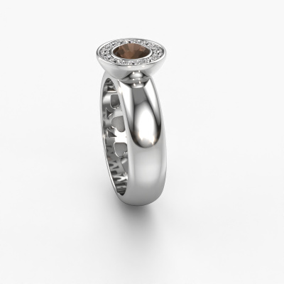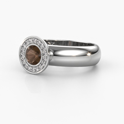 The ring shown above is called Anna. This type of ring is known as a solitaire ring. The 14 Carat white gold ring is set with a 5 mm round smokey quartz centre stone surrounded by smaller sized diamonds. This halo white gold halo ring, is set with a big smokey quartz embraced by smaller sized gemstones. The ring got its name for its halo which the smaller sized diamonds help create. In order to achieve a stunning halo, these smaller sized gemstones have to be aligned perfectly so light reflects evenly on the smokey quartz from every angle. And our expert goldsmiths get the job done. Each carefully selected smokey quartz is set by hand with utmost precision. During manufacturing, light fall is constantly monitored to make sure the special halo effect is still visible. In the end you get a unique ring with a radiant smokey quartz gemstone centrepiece. An exquisite ring indeed! The halo Anna ring, as shown here, can be customized to your liking. Our online tool offers many different options but please feel free to contact us if you want changes made to your Anna ring, which are unavailable in our online tool.Are you on a budget? Please feel free to contact us, so we can go discuss your options. We offer our rings at guaranteed best price, because we make them to order. You won't find such a price anywhere else!To make it easier for you, we offer a 30 day return policy. Check our terms and conditions.