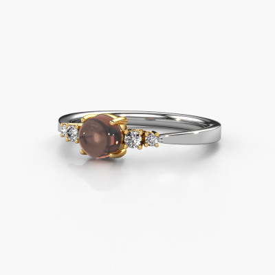 In this photo the white gold Regine ring is set with a cabochon smokey quartz. Cabochon means a smokey quartz is shaped first, not faceted, into a specific shape, such as a drop, heart or round cabochon. Subsequently, it is polished until the gemstone has a orb shaped surface. A cabochon gemstone is a stunning, classy eye-catcher that matches perfectly with a contemporary as well as a vintage style. Our expert goldsmiths shape the 5 stones ring to perfection which makes it unique. The cabochon smokey quartz is set so its unique qualities are strengthened. Our goldsmiths passionately create your customized ring to your liking with the utmost care. The white gold ring, as shown here, can be customized using our online tool. Feel free to ask our jewel designers for assistance if you want changes made which are unavailable in our online tool. We are happy to answer your questions.Are you on a budget? Please feel free to contact us, so we can go discuss your options. We offer our rings at guaranteed best price, because we make them to order. You won't find such a price anywhere else!To make it easier for you, we offer a 30 day return policy. Check our terms and conditions.