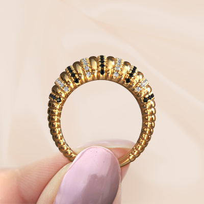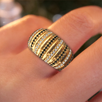 This is a stunning wide gold Dawn 12mm ring. It is set with black diamond. A designer ring, fit for classy women. The ring is designed by our own expert goldsmiths. In our artisan studio, we use a combination of the latest techniques and ancient traditional craftsmanship, so we are able to create a perfectly designed ring. Our expert goldsmiths strive for perfection so they won't stop until a perfect ring, a true work of art, is created. A unique ring which matches your own style. The wide Dawn 12mm ring, as shown here, can be customized to your liking. Our online tool offers many different options but please feel free to contact us if you want changes made to your Dawn 12mm ring, which are unavailable in our online tool.By using a combination of the latest modern techniques, combined with ancient crafting, we can make all our rings in our own studio. Each jewel is made to order. This is advantageous because we can offer you a price you won't find anywhere else.To make it easier for you, we offer a 30 day return policy. Check our terms and conditions.