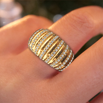 This is a stunning wide gold Dawn 12mm ring. It is set with lab grown diamond. A designer ring, fit for classy women. The ring is designed by our own expert goldsmiths. In our artisan studio, we use a combination of the latest techniques and ancient traditional craftsmanship, so we are able to create a perfectly designed ring. Our expert goldsmiths strive for perfection so they won't stop until a perfect ring, a true work of art, is created. A unique ring which matches your own style. The wide Dawn 12mm ring, as shown here, can be customized to your liking. Our online tool offers many different options but please feel free to contact us if you want changes made to your Dawn 12mm ring, which are unavailable in our online tool.By using a combination of the latest modern techniques, combined with ancient crafting, we can make all our rings in our own studio. Each jewel is made to order. This is advantageous because we can offer you a price you won't find anywhere else.To make it easier for you, we offer a 30 day return policy. Check our terms and conditions.